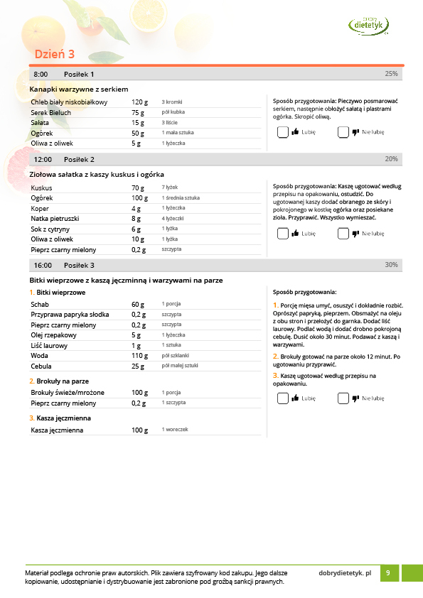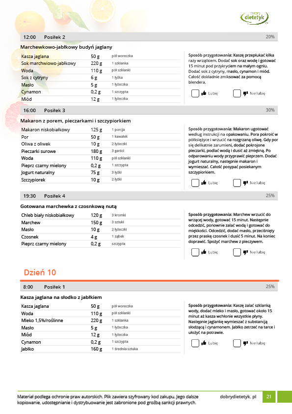 • w formie precyzyjnych jadłospisów wielodniowych (na każdy dzień miesiąca jest opracowany osobny jadłospis). Tutaj nie musisz zastanawiać się co zjeść każdego dnia, gdyż będziesz mieć dokładnie wszystko rozplanowane.