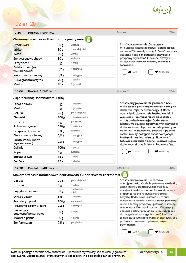 Kompleksowy, 30 dniowy program dietetyczny dla WEGETARIAN z przewagą dań na THERMOMIX. Jadłospis oparto o produkty pochodzenia roślinnego z niewielkim dodatkiem produktów mlecznych i jaj. Dieta została skomponowana przez zespół dietetyków specjalizujących się w tematyce diety wegetariańskiej. Ta bardzo urozmaicona, niezwykle pożywna i wyjątkowo smaczna dieta zadowoli każdego, kto szuka zdrowych i wartościowych dań wegetariańskich. Pod względem odżywczym w diecie położono w szczególności nacisk na podaż takich składników jak białko, żelazo, witaminy grupy B oraz wiele minerałów których często brakuje w dietach roślinnych. Dieta idealnie nadaje się dla osób, chcących też spróbować takiego modelu żywienia.