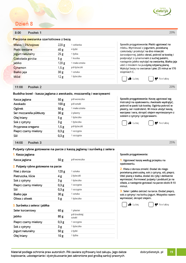 • w formie precyzyjnych jadłospisów wielodniowych (na każdy dzień miesiąca jest opracowany osobny jadłospis). Tutaj nie musisz zastanawiać się co zjeść każdego dnia, gdyż będziesz mieć dokładnie wszystko rozplanowane.