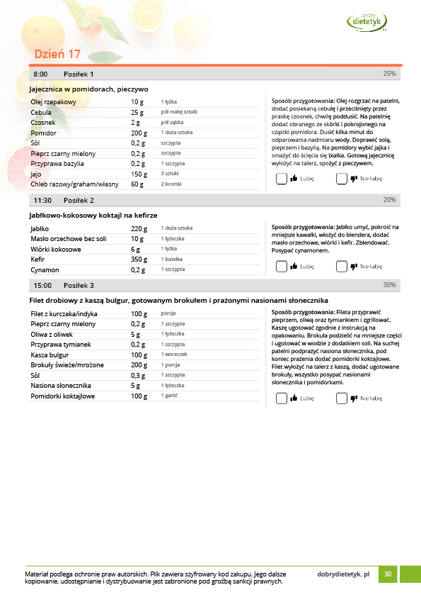 • w formie precyzyjnych jadłospisów wielodniowych (na każdy dzień miesiąca jest opracowany osobny jadłospis). Tutaj nie musisz zastanawiać się co zjeść każdego dnia, gdyż będziesz mieć dokładnie wszystko rozplanowane.