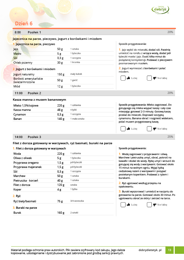 • w formie precyzyjnych jadłospisów wielodniowych (na każdy dzień miesiąca jest opracowany osobny jadłospis). Tutaj nie musisz zastanawiać się co zjeść każdego dnia, gdyż będziesz mieć dokładnie wszystko rozplanowane.